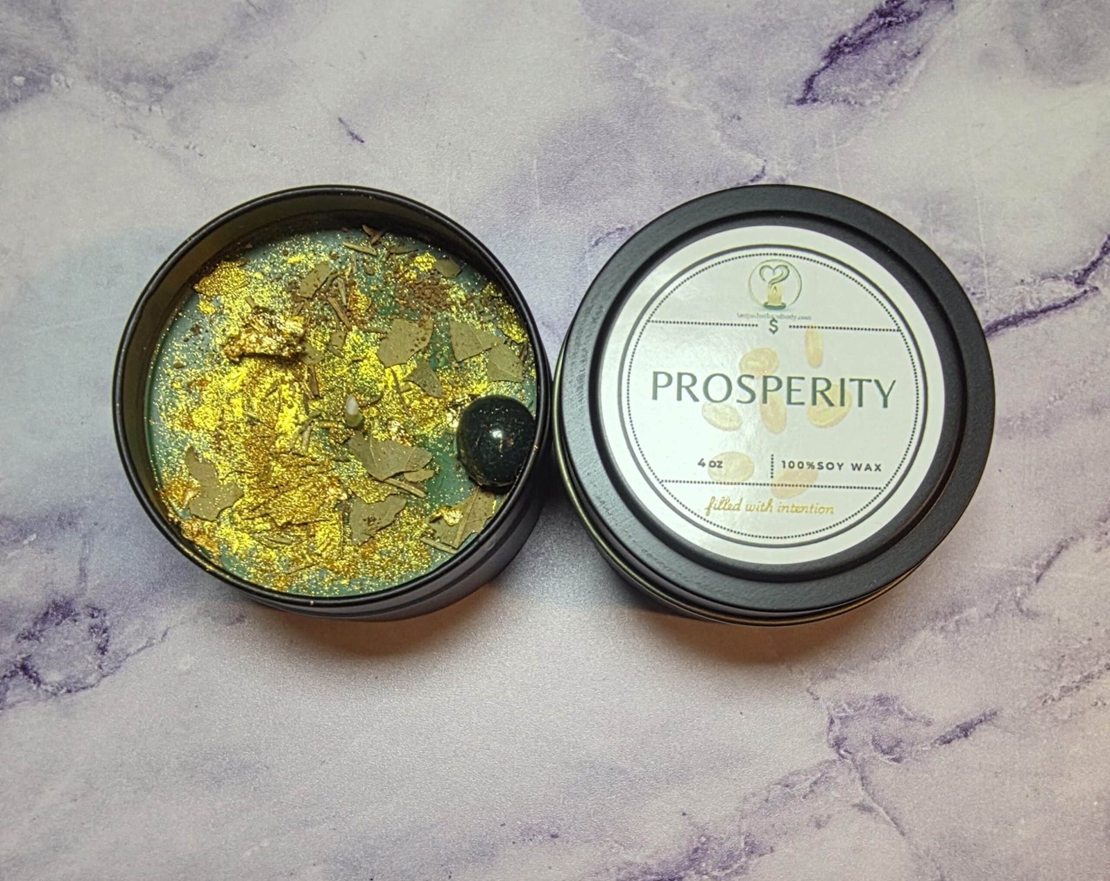 - Hand poured prosperity candle made with 100 percent natural soy wax